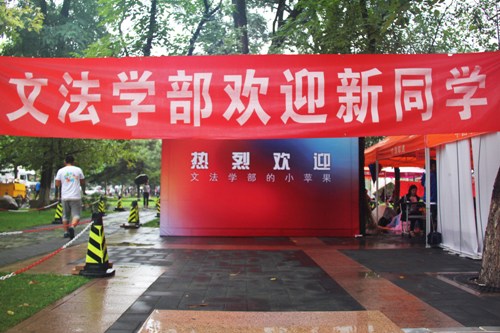 早晨七点,来自全国各地的新生陆续到达报到现场。为了鼓励新生独立迈出大学的第一步,志愿者们主动引导学生家长在休息区等待。报到处立着崭新的“欢迎文法学部小苹果”的大型喷绘,报到入口处醒目地贴着报到的流程安排和注意事项,并在一旁设有介绍大学生活的宣传展板,新生或家长若有任何疑问,咨询台的工作人员随时提供耐心细致的讲解。在老师和志愿者们的帮助下,新生们顺利完成了交入学通知书、手续单盖章、交档案和党团户籍材料、办理体检、激活“校园一卡通”、领取军训用具等手续,并收到了一个由文法学部贴心准备的入学材料袋,袋中装有迎新日程表、新生手册和指南、校园地图等等,其中还有为新生和家长特意准备的两本新生指导用书《不要等到毕业以后》《和孩子一起读大学》,以及《文法学部2014级新生手册》和学部的学生刊物《镌思》。此外,文法学部还给每一位“文法新鲜人”发放了一件精心设计的印有学部logo的卫衣,为雨中略带寒意的迎新现场注入了一丝温暖。报到全程都有工作人员为新生们拍照留念,老师和志愿者们真诚细致的服务消除了新生的紧张和不安,使他们感受到了文法学部大家庭的活力和热情。