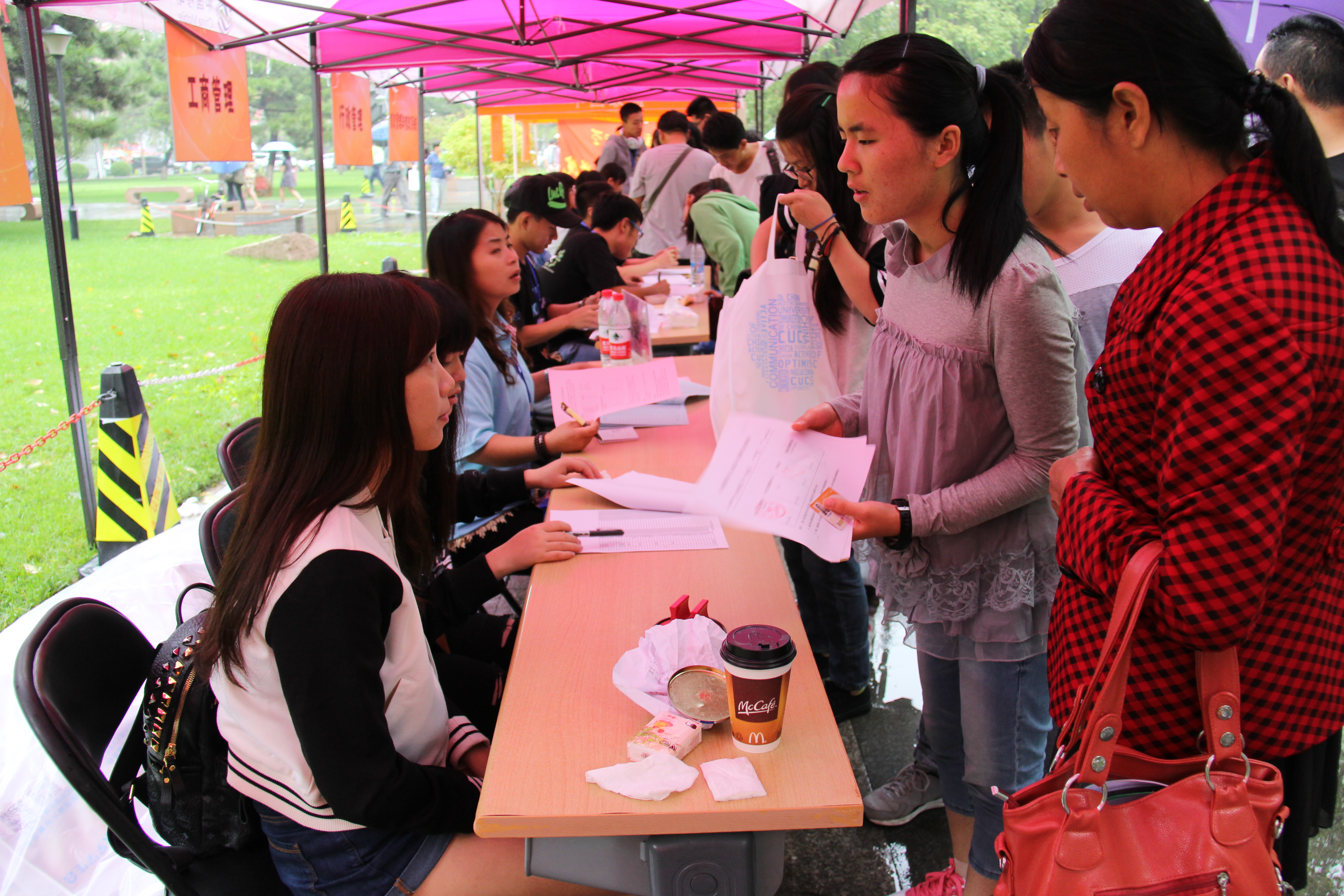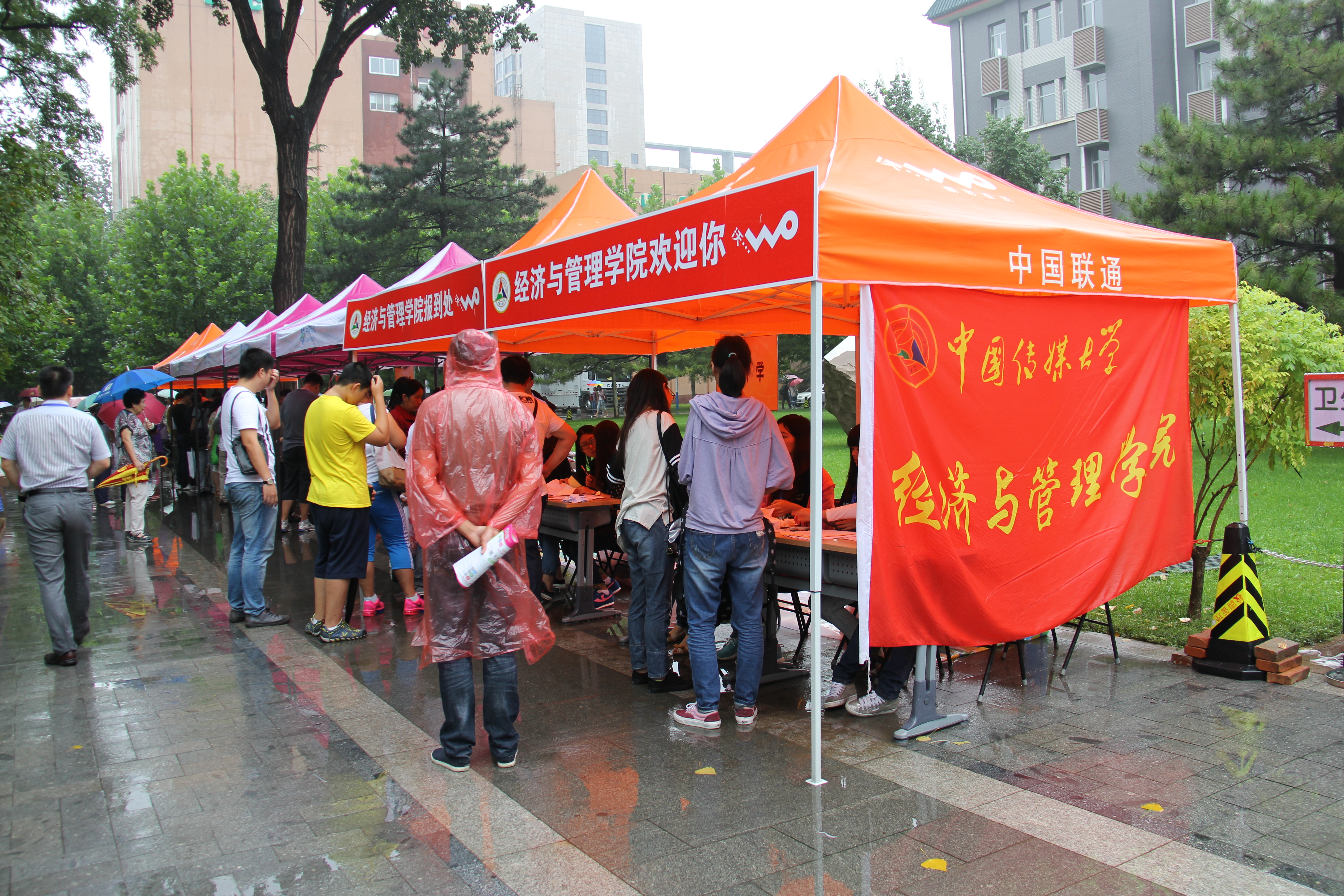 在此次迎新接待中,经管学院充分践行以人为本的工作理念,尽量简化报到步骤,快速准确的完成报到流程,让新生感受到高效率的工作方式,同时,印发新生入学手册,制作清晰的日程表格,告知学生在军训前每天的活动安排。在新生入学手册中,加入了习近平总书记对青年的讲话(“青年要自觉践行社会主义核心价值观(节选)——在北京大学师生座谈会上的讲话”),引导新生树立社会主义核心价值观。学院还为新生设计发放了院服,使他们尽快融入学院。在一侧的袖口上,学院还专门加上了学校60周年的标志,以此留作永久的纪念。迎新当天,北京不常见的暴雨使清晨透着丝丝凉意,经管学院师生在专程为家长等待、休息的帐篷中为家长和新生发放最具有广院特色的肉饼,为寒冷的天气带去了暖意,同时,学院也为家长和新生们准备了雨伞和雨衣,方便大家的使用。