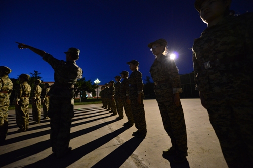 当晚,2014级全体受训新生一起在基地欢度中秋佳节,为了不让同学们在第一个远离父母的节日中感到孤单,军训团悉心地为大家准备了月饼,并在晚训练的时间增加了赏月、学唱校歌等丰富的节目。当晚,全体女同学按计划完成了第一次洗澡,秩序井然。