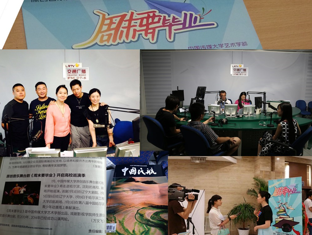 本课组由多个专业的5位指导教师、32位学生组成,于7月1日至15日在沈阳、哈尔滨两个东北省会城市,辽宁大学、哈尔滨工程大学两所全国重点高校及辽宁大剧院、哈尔滨环球剧场两家社会知名剧院将《周末要毕业》成功落地上演。本剧所到之处掀起一股股强烈的青春热潮,也强化了这一代表着中国传媒大学艺术类多专业学生联合创作水准的戏剧品牌,同时极大地提升了我校的影响力价值。
