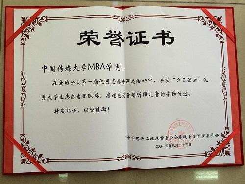 MBA学院举办的一系列公益活动,不但受到社会的关注和广泛好评,而且还提高了学校的社会知名度。中传MBA将用自己的点滴努力奉献爱、用团队力量传递爱,用传媒专业传播爱。
