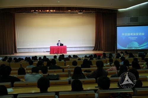 外交部干部司考试录用处副处长马跃以“激情与梦想碰撞,梦想从这里启程”为主题,通过对“我为何选择外交部”、“外交部为何选择我”以及“如何报考外交部”三个问题的解答,详细介绍了外交部招考的职位要求、程序及青年外交官职业发展规划等内容,并向有志于加入外交部的同学们提出三点希冀:要靠得住、要有本事、要肯奉献。
