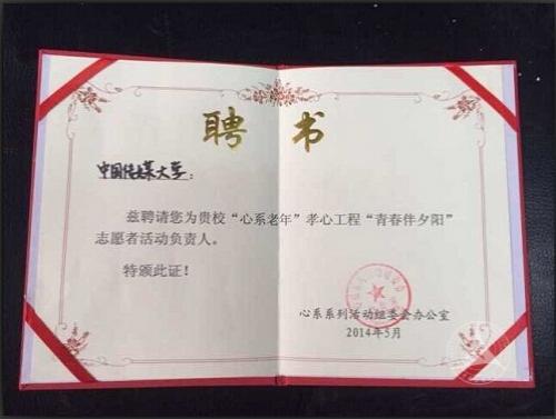 运动会开始之前,夏青主任向我校青协授予了“心系老年”孝心工程“青春伴夕阳”志愿者团成员单位铜牌,同时,为我校颁发了“心系老年”孝心工程“青春伴夕阳”志愿活动负责人聘书。