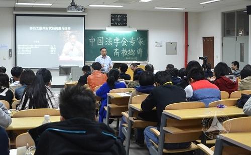 安博所王守亮主任主讲“移动互联网时代的机遇和发展模式”, 他介绍了安博所的服务模式,强调成功与出身、学历、长相、性别无关,只与一个人对梦想的渴望和自信有关,鼓励同学们寻找自己的梦想并为之不断努力。