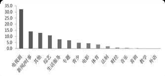 相比之下,观众热衷的电视内容更偏娱乐,且受欢迎的频道类型与内容之间的关系,不如广播那么一致和单纯。在节目内容收视份额排行榜上,电视剧占绝对优势(32.1%),新闻、综艺紧跟其后(见图4);但在频道收视份额排行榜上,无论全国市场还是大多数地方市场,位列榜首的以综合频道居多,专业频道少见。例如,央视一套长期名列收视份额前茅,其收视率最高的节目却不一定是电视剧,观众观看一套也不完全是收看电视剧;同样的现象也多见于省级卫视,或许这是因为省级卫视一方面要满足作为省级综合性传播窗口的指令性要求,另一方面又要走特色化路线以适应电视竞争的需要。