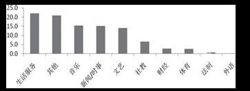 受众对广播和电视的内容诉求和偏好略有不同。广播的资讯和音乐等内容较受听众欢迎,且听众收听的主要频率与其收听的节目内容之间大体一致。2013年央视-索福瑞收听率调查显示,听众收听的主要频率类型有新闻综合、交通、音乐和文艺频率,与2012年相比变化不大;在节目类型上,生活服务类(包括交通)节目收听份额在所有节目类型中占比最高(21.9%),超过五分之一;除“其他”外,以下依次是音乐、新闻/时事、文艺、社教等(见图3)。广播资讯类和音乐类节目所占收听份额较高,主要因为这些节目适合伴随性和移动性收听,也符合早晚交通高峰期的收听环境和受众的内容需求。