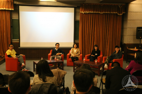在交流环节中,艺术学部校友、青藤文化联合创始人、《明白学堂》总导演、知名新媒体导演李沁遥,比邻联合创始人、首席市场总监王群斌,短裤视频运营总监朱丹青,创业魔法学院CEO陆伟一起和大家分享了他们的创业历程。在交流过程中,师生和创业者各抒己见,共同分享经验,对深层次的问题进行了探讨和研究。
