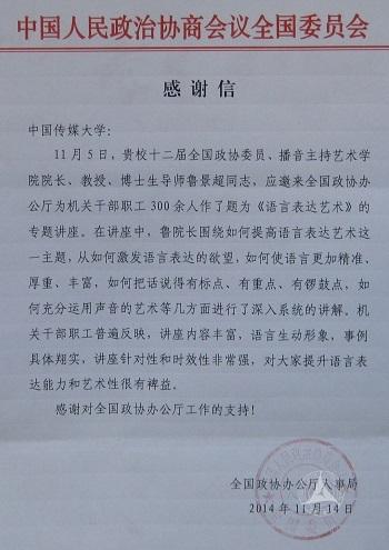 11月5日,我校全国政协委员、播音主持艺术学院院长鲁景超教授应邀前往全国政协办公厅为机关工作人员300余人做了题为“语言表达艺术”的专题讲座,获得热烈反响,主办方给予高度评价。