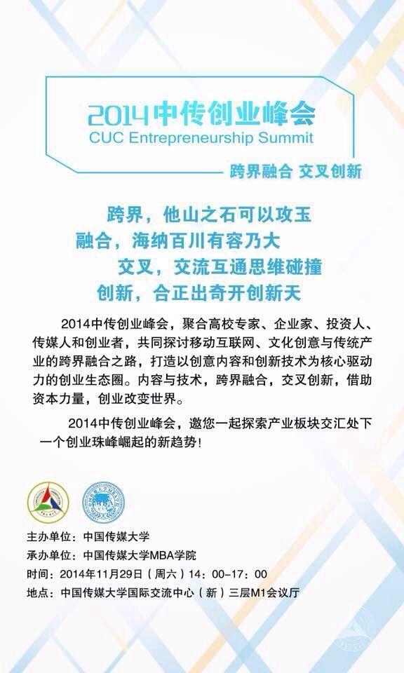 时代发展,技术革新,市场的细分产生了一个又一个的新机遇,创业者登上了这个时代的主舞台。创业不仅要执着赶路,还要抬头看路,如何抓住市场上转瞬即逝的机会,如何成功的找到市场需求成为了成功的关键。 2014中传创业峰会,聚合企业家、投资人、传媒人、创业者和高校专家,共同探讨移动互联网、文化创意与传统产业的跨界融合之路,打造以创意内容和创新技术为核心驱动力的创业生态圈。内容与技术,跨界融合,交叉创新,借助资本力量,创业改变世界。 2014中传创业峰会,邀您一起探索产业板块交汇处下一个创业珠峰崛起的新趋势! 主办:中国传媒大学 承办:中国传媒大学MBA学院 时间:2014年11月29日(周六)14:00-17:00(入场时间13:30) 地点:中国传媒大学国际交流中心(新)三层M1会议厅 入场提示:此次活动面向全校师生、校友开放,不需要入场券。 附:校外嘉宾(部分) 陈亨达 香港经纬集团有限公司执行董事 阮 伟 中传MBA实践导师、新浪体育CEO 褚 军 中传MBA实践导师、中锐科技股份有限公司董事长 李树斌 中传校友,好乐买CEO 郎春晖 创新工场合伙人
