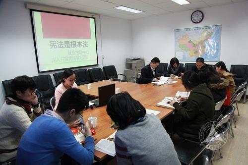为响应教育部关于在国家宪法日深入开展宪法学习宣传活动的号召,就业指导中心于12月1日召开了主题为“宪法是国家根本法”的宪法学习活动。就业指导中心主任林林、教师韩伟、王彧带领中心学生助理集中学习了《中华人民共和国宪法》及十八届四中全会精神。