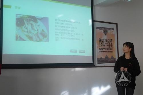 活动首先由来自埃及的林黛玉同学为大家展示讲解家乡文化。七千年文化的孕育出现了令人神往的古埃及文明,奔流不息的尼罗河,古老的金字塔,神秘的阿蒙教,悠远的法老文明;接着,黛玉又为大家展示了她的家乡——开罗,一个富饶文明的城市。黛玉富有古埃及人的温儒,又表现着现代埃及的激情,让同学们看到一个更加真实、更加迷人的异域国度。