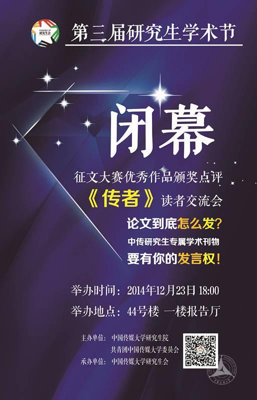 本次学术节闭幕式暨颁奖典礼,将特别设置《传者》期刊的交流环节。中传《传者》期刊,是为广大中传研究生学子提供的学术交流平台。它的成长,需要你的参与!来到现场,你就可以做主你自己的学术期刊!