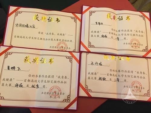 我校获得“2014年首度高校‘青春红丝带’社团先进集体”称号和“我青春,我健康”——首都高校大学生防艾微作品征集大赛优秀组织奖;我校学生李南石获得“我青春,我健康”——首都高校大学生防艾微作品征集大赛海报类一等奖,朱丹妮获得视频类二等奖,夏鹏飞获得海报类优秀奖。