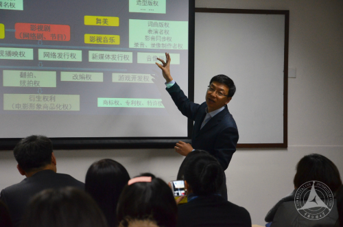 王军律师首先向大家展示了影视权利链,包括影视改编权、摄制权、放映权、网络发行权、广告招商权、游戏开发权、录音录像制作者权、表演者权等,贯穿于影视剧投资、制作、发行环节的全过程。作为引发社会广泛关注的“琼瑶诉于正著作权侵权案”中原告琼瑶女士的代理律师,王军律师通过剧本时间轴、人物设置图和人物关系图对《梅花烙》和《宫锁连城》之间存在的实质相似性进行了比对,并介绍了争议剧本的著作权归属、专家辅助人、抄袭性相似和改编性相似的比较以及改编权与摄制权关系的认定等问题。他还结合多个影视法案例,对于合作作品、编剧合同的性质、字幕署名、不正当竞争、导演合同纠纷、行规与约定、植入广告、投资保底回报等疑难问题进行了生动形象的讲解,最后还分析了影视合同的基本条款,影视项目投资的关注点,版权、投资、发行类合同审查的关注点。