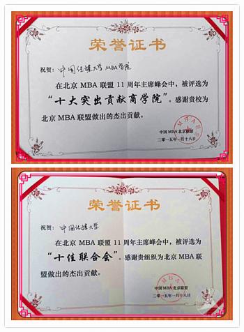 (通讯员 张利春)2015年1月18日上午,“2015年投资热点论坛暨北京MBA联盟11周年主席峰会”在中国科学院数学与系统科学研究院思源楼一层报告厅举行。MBA学院在本次论坛上荣获“十大突出贡献商学院”称号。获此殊荣还有:北京大学光华管理学院、中国人民大学商学院、北京理工大学管理与经济学院、北京航空航天大学经济管理学院、首都经济贸易大学经管学院、北京交通大学经济管理学院、北京科技大学经济管理学院、华北电力大学经济与管理学院、中国科学院大学管理学院。
