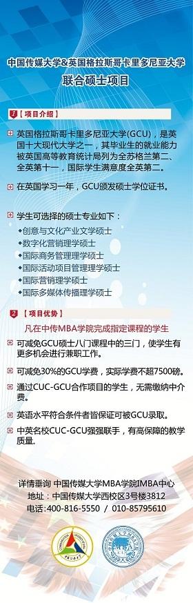 学生在GCU学习期间,由于之前进行过中传MBA的学习,只需读8门必修课课程中的5门,而且可以减免30%的学费。通过论文答辩后,获得GCU颁发的第二硕士学位。同时,中传MBA学院还与GCU联合开设了博士(PhD)课程。