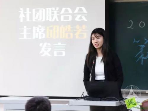 大会进行到第四项,由优秀社团代表自然科学社社长上台发言,她详细介绍了其社团的工作及社团活动规则的重要性,还强调了社团与社联的密切联系和合作必要性。随后,公益学术中心部长陈昱璁向大家说明社团智慧分享会“思享者”活动的相关事宜,并就此活动的梦想基金的获得方式做了详细介绍。