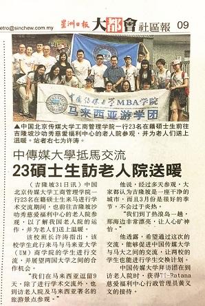 福利中心负责人黄义文介绍该福利院是马来西亚最大的慈爱福利中心,由马亚西亚华人和热心义工倡仪成立,目前收容了几百名老人和孤儿。同学们自发的在福利中心为老人们搬运物资,捐款献爱心,和老人们聊天,赢得了老人们的赞赏。马来西亚当地最大华文报纸《星洲日报·大都会社区报》关注了此次活动并进行报道。