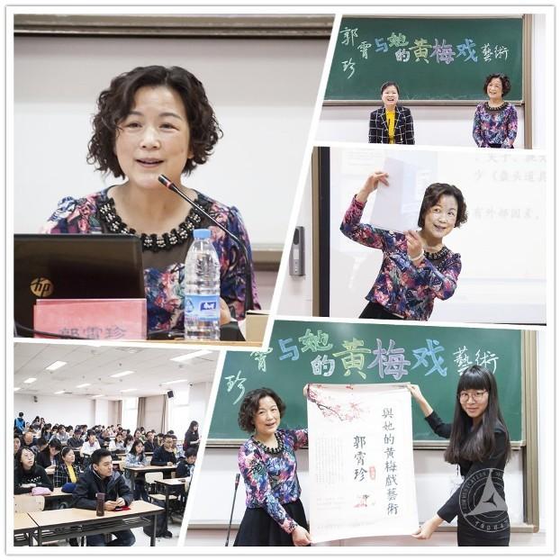 郭霄珍老师向同学们简单介绍了自己作为演员和作为教师的个人经历,依次讲解了黄梅戏的故乡安庆、黄梅戏的起源和发展、黄梅戏的代表作品和当下传统戏曲的传承与发展等情况。郭老师表示,要继承守护好传统演艺的精髓,让更多的年轻观众了解体会到传统戏曲的魅力。她结合自己编排的《闹花灯》来为同学们详细解析其精妙构思和黄梅戏中蕴含的艺、技、美。最后,郭老师分享了十个戏曲守望者的关键词以及其心语,与同学共勉。