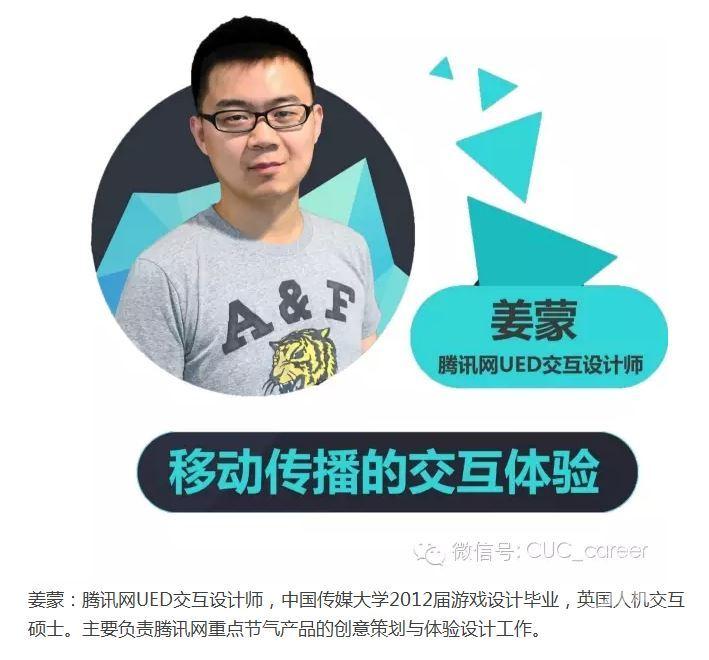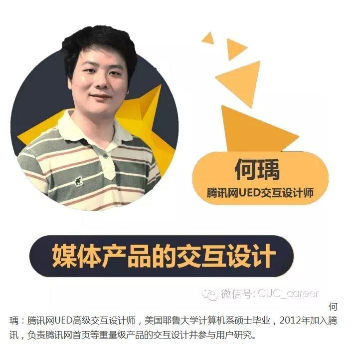 活动时间:2015年6月17日14:00 活动地点:48教A902 发布者: 中国传媒大学就业指导中心 中国传媒大学“职场传媒人”系列讲座正式开讲啦! 由CDA职业发展社举办的“职场传媒人”系列讲座将邀请各行业精英来校交流,向各位同学传播职场知识,解答职场疑惑,帮助同学们确立职业规划。第一场腾讯网新媒体创新设计 作为“职场传媒人”系列讲座的第一场,我们特邀腾讯网UED设计总监任婕等4位嘉宾担任主讲人,带我们开启全新的职场之旅,向我们介绍腾讯网新媒体的创新设计。 主讲人及讲座主题