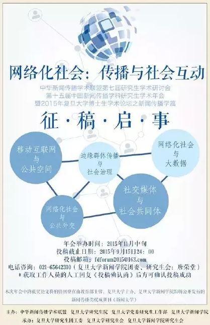 复旦大学新闻学院将于2015年11月中旬举行“中华新闻传播学术联盟第七届研究生学术研讨会”、第十五届“中国新闻传播学科研究生学术年会”暨“复旦大学博士生学术论坛之新闻传播学篇”,会期两天。今年年会的主题为“网络化社会:传播与社会互动”,下设“移动互联网与公共空间”、“网络化社会与大数据”、“社交媒体与社会共同体”、“边缘群体传播与社会治理”、“网络化社会与公共外交”等五个子课题。