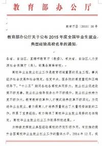 (通讯员 王芯蕊)近日,教育部办公厅下发了《关于公布2015年度全国毕业生就业典型经验高校名单的通知》,正式发布了2015年度全国毕业生就业典型经验50所高校名单。我校经过申报推荐、专家初选、第三方机构用人单位满意度及毕业生满意度调查、专家进校实地调研等环节考核,最终荣获“2015年度全国毕业生就业典型经验高校”荣誉称号。