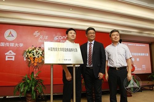 廖祥忠副校长、冯守华主任、朱灵总裁为“中国传媒大学超级蜂巢孵化器”揭牌