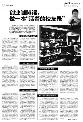 (通讯员 王航)7月21日,《北京晚报》以《创业咖啡馆——做一本“活着的校友录”》为题,用整版篇幅报道了我校MBA学院2010级校友梁陈的创业项目——博闻咖啡馆。