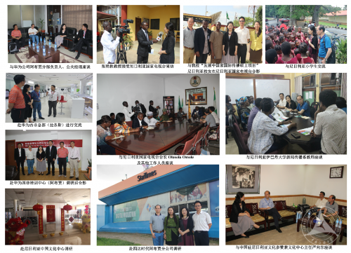 在尼日利亚调研中,调研团前往中国在非数字电视运营四达时代的尼日利亚分公司, 了解其在尼日利亚的业务开展及该公司在非洲广播电视数字化转换过程中所发挥的作用;分别在华为公司阿布贾的分公司及在拉各斯的西非总部调研中,团队调研了中国企业在当地履行社会责任、推动当地通信事业发展及开展本土员工培训等情况;在中国驻尼使馆、尼中国文化中心调研时,团队成员与文化参赞兼文化中心主任严向东先生深度交流,了解了中尼文化交流及国对尼公共外交的情况;在访问尼日利亚国家电视台(NTA)中,调研团队与该台台长Olusola Omole先生及新闻部等部门负责人举行了会谈,就尼日利亚电视数字化转换的进展、电视传播效果评估及来华人员培训等情况进行了交流,并接受了NTA的采访。