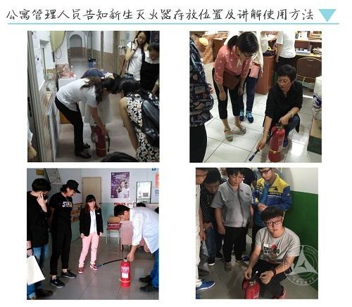 新生办理住宿手续后,各公寓楼管理人员即时对新生宿舍进行安全检查,了解学生情况,不厌其烦地对每个新生房间逐一讲解学生公寓住宿相关事宜及注意事项,并耐心地告知新生灭火器的存放位置及使用方法。