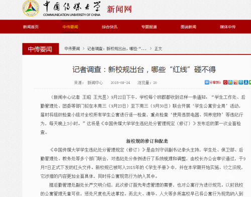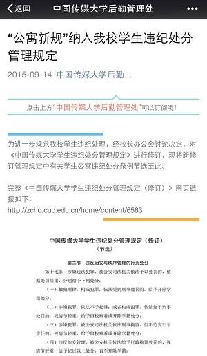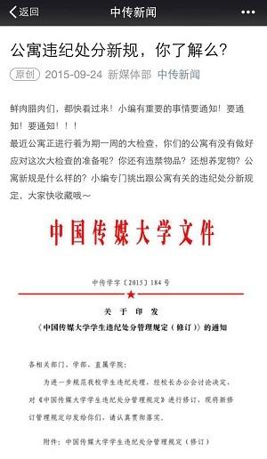 9月24日,中传电视台新媒体部以“公寓违纪处分新规,你了解么”进行推送,同时,《中传新闻》也进行了采访和报道。