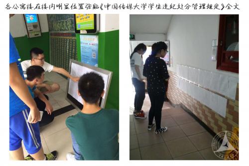 9月7日,学校正式发布了修订后的《中国传媒大学学生违纪处分管理规定》,将学生公寓行为管理纳入校规。自此,公寓管理更趋规范,有章可循,有法可依。为使全校学生迅速了解修订后的新规,遵守学校规章制度,自觉维护公寓安全,在全校营造公寓安全宣传氛围,后勤管理处联合多部门,采取多种方式进行了立体式、多方位的宣传推广,引发学生广泛关注,取得了较好的宣传效果。