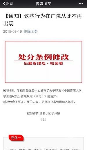 9月19日,校团委“传媒团英”微信公众号以“这些行为在广院从此不再出现”为题进行了推送,从学生角度对新规的变化进行了重点的介绍,受到学生们的广泛关注。