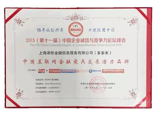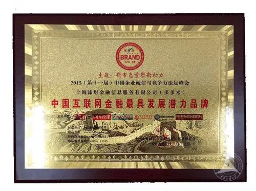 多多米成立于2015年2月,是由上海添彤金融信息服务有限公司推出,由上海清华同仁企业发展有限公司与中航化集团控股的互联网理财服务平台。作为一家助力企业发展与提高投资者收益的服务平台,多多米始终以“安全”为经营管理核心理念,建立完善的风险控制体系,严格把控知名投资机构已投或拟投优质中小企业债权,通过与大型基金公司、担保公司合作,在为理财用户提供高收益低风险渠道的同时,全面保障理财用户的资金与交易安全。此次峰会颁发的“信用中国▪中国互联网金融最具发展潜力品牌”奖项正是对多多米诚信经营的认可。