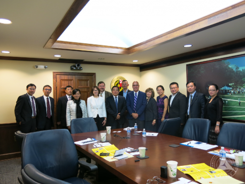 离开乔治城大学,代表团来到了马里兰大学,马里兰大学副校长罗斯·勒温、国际事务办公室和传播学院的负责人接待了代表团一行。为提升教学及管理水平,我校曾组织两批人员赴马里兰大学进行培训,苏校长代表学校对此表示感谢。会谈过程中,代表团了解到马里兰大学传播学院具有很强的师资力量,其院长伊丽莎白·托斯教授是美国传播教育者联合会主席、副院长曾担任美国传播学会副会长。苏校长表示,欢迎传播学的一些国际会议到中国传媒大学举办。双方还就加入我校发起的传媒高等教育国际联盟和共同招收同声传译专业学生达成了合作意向。