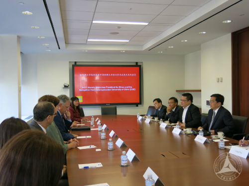 18日上午,代表团首先来到纽约理工学院,校长爱德华·朱利亚诺博士对我校代表团的到来表示热烈欢迎,并高度评价了两校之间的合作项目。此前,教育部批准了在我校设立中外合作办学机构——国际传媒教育学院,学院首批30多名学生正在纽约理工学院校区学习。苏校长对纽约理工学院务实、高效的工作作风给予赞扬,并对即将来我校授课的教师表示欢迎。会谈期间,两位校长还就召开媒体融合创新发展论坛和有特色的高端国际会议达成合作意向。会谈结束后,代表团一行看望了正在这里学习的我校学生。