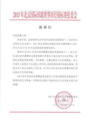 (通讯员 张芊)近日,北京市召开2015北京国际田联世界田径锦标赛总结表彰大会。我校荣获“优秀组织单位”和“最佳支持单位”等称号,志愿者组织工作获得了北京田径世锦赛组委会的高度肯定和赞扬,并特意向我校发来感谢信。