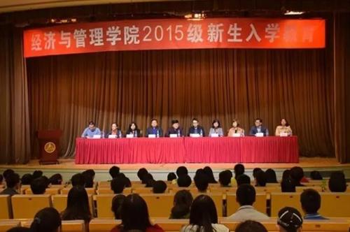(通讯员 朱沁怡 摄像 吕虹熳)10月14日晚,经济与管理学院2015级新生入学教育大会在综合楼四百人报告厅举行。经济与管理学院院长张树庭、党委书记董克柱、副院长李珍晖、谢伦灿以及系主任姚林青、王晓艳、高慧军、林振宇和孙江华等出席。学院党委副书记毛建国主持会议。
