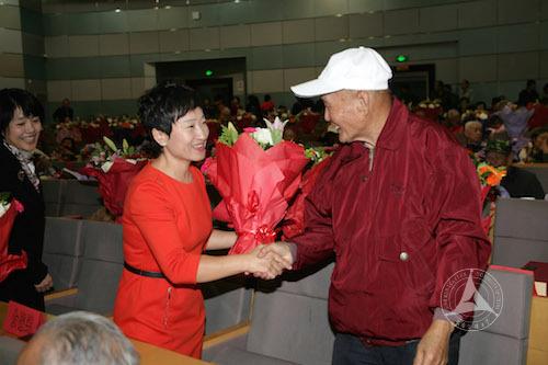 大会为我校今年满70岁、80岁、90岁的老同志集体祝寿。离退休处副处长赵永峰宣读了54位寿星的名单,向他们表示生日的祝福;大会还表彰了离退休人员中的夕阳红合唱团、书画学会等先进协会”、63名“长寿老人”、22名“好公婆(岳父母)”及13名“热心公益活动之星”,并向他们颁发了证书和奖品。