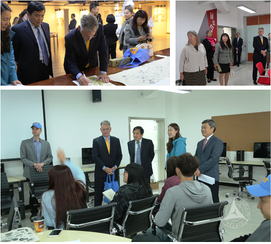 纽约理工学院中国区首席代表Monique Taylor、校长特别助理Victoria Pfeiffer等六人随同到访。国际传媒学院常务副院长罗青教授组织各部门进行了工作汇报。国际交流与合作处处长梁岩、教务处副处长金雪涛、西校区管委会主任徐宝泉、艺术学部副学部长周涌及国际传媒教育学院教学、管理团队陪同参加会见。