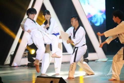 力量与优雅的碰撞,激情与速度的结合。泰拳道士们在幕景中的熊熊烈火中翻腾跳跃,旋风踢、单手破板、腾飞踢板一招一式尽显青春本色。更有小跆拳道士前来助阵,点燃全场激情。
