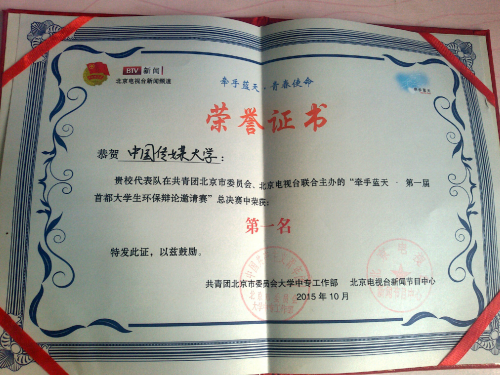 (通讯员 张芊)10月24日,由北京电视台及北京团市委联合举办的“牵手蓝天”首都大学生环保辩论赛落下帷幕。本次活动旨在通过辩论的形式,引导大学生并带动全社会深刻认识目前的环境状况,积极参与绿色北京建设。我校辩论队同学以优秀的综合表现获得了比赛的冠军,徐梦同学获得了“优秀辩手”的称号。