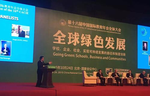 中国国际教育年会由中国教育国际交流协会主办,今年的主题为“全球绿色发展:学校、企业、社会,实现可持续发展的路径和制度创新”。年会主论坛从专业、客观的角度,剖析绿色发展与知识经济跨界竞合的未来发展趋势,共同探讨学校、企业、社会实现可持续发展的路径和制度创新。