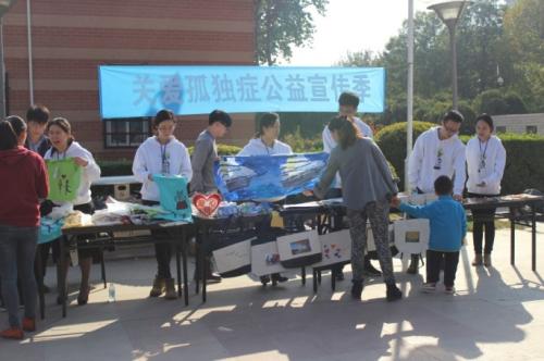 早上9点,志愿者们前往晚会举办地——大兴妇女儿童活动中心附近的康庄公园北门进行爱心义卖和晚会宣传活动。爱心义卖是向市民朋友出售绘有孤独症儿童画作的衣服、围巾、明信片和由其制作的手链。在13级播本党支部志愿者们和主办方人员的努力下,义卖进行火热,宣传工作也及时到位。