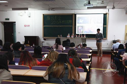 (通讯员 宋晨)11月5日下午,腾讯影业2016届毕业生校园宣讲会在我校44号楼顺利举行。腾讯影业2016年计划招聘动画电影编剧、分镜师、美术设计等岗位,招聘会吸引了我校100多名相关专业毕业生参加。