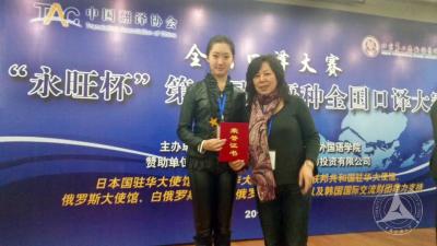 (通讯员 盖莲香 摄影 甄权铨)11月7日,“永旺杯”第八届全国多语种口译大赛在北京第二外国语学院拉开帷幕。本次大赛由中国翻译协会和北京第二外国语学院联合主办,是国内唯一的国家级翻译大赛,全国参赛高校41余所,参赛语种5个, 参赛优秀选手80多名。我校参加此次大赛的唯一选手是外国语学院2012级法语专业的甄权铨同学。她凭借扎实的基本功与敏捷的反应能力,一路过关斩将,最终获得三等奖的好成绩。