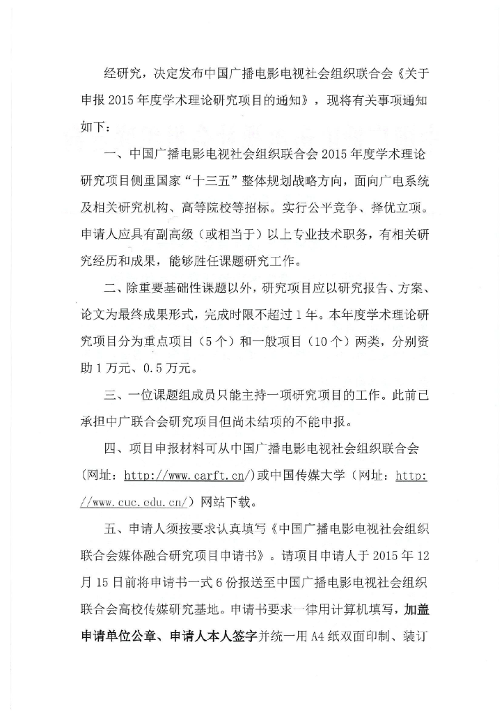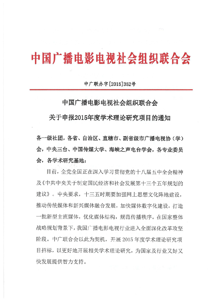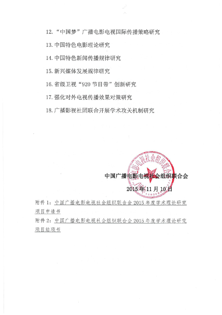 附件1 中国广播电影电视社会组织联合会2015年度学术理论研究项目申请书附件2 中国广播电影电视社会组织联合会2015年度学术理论研究项目结项书