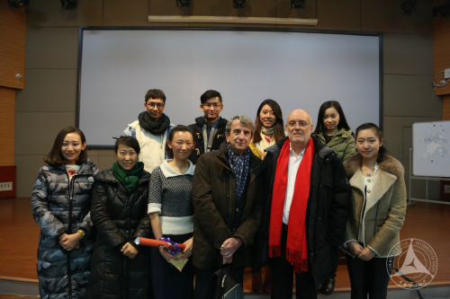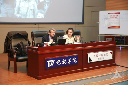 新闻传播学部电视学院副院长曾祥敏教授主持了此次讲座。讲座前,新闻传播学部党委书记、副学部长胡芳与罗授先生及一同来校的法语联盟基金会驻华总代表、北京法语联盟校长罗迪塞尔先生进行了会见。