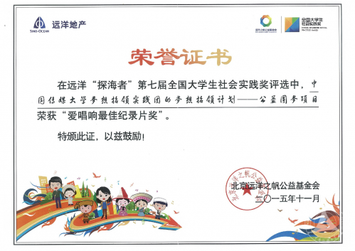 (通讯员 李竞 摄影 李苏萌 李天宇 邱悦)11月27日,2015远洋“探海者”第七届全国大学生社会实践奖暨2015“爱唱响”第二季感恩音乐会在国家图书馆音乐厅正式落幕。我校新闻传播学部暑期实践团队“梦想招领计划”受邀参加演出并获得“爱唱响最佳纪录片奖”。