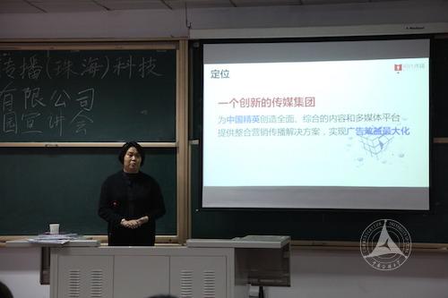 宣讲会由一段名为“现代传播20年”的影片开场,详细描述了现代传播自1993年创办至今20年的发展历程。张红巍副总监介绍道,现代传播以“传播真理,传播潮流,传播品味”为目标,旗下拥有《周末画报》、《优家画报》、《彭博商业周刊》等刊物,集团目前正努力从magazine到mobile为中国精英提供全面、综合、多媒体平台的整合营销传播。